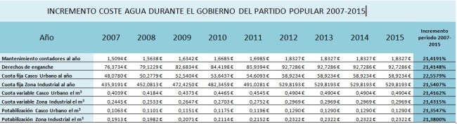 A lo largo de este mandato hemos tenido que escuchar varias veces en Pleno por boca del portavoz del Grupo Popular que su partido no subió el precio del agua. Como todo el mundo puede imaginar, esta cuestión es sencilla de comprobar puesto que los precios y tasas se fijan a través de las ordenanzas fiscales y se publican en el Boletín Oficial de la Provincia, por no decir, que los ciudadanos reciben una factura trimestral en sus domicilios en la que vienen detallados los conceptos por los que pagamos que el agua salga por el grifo.